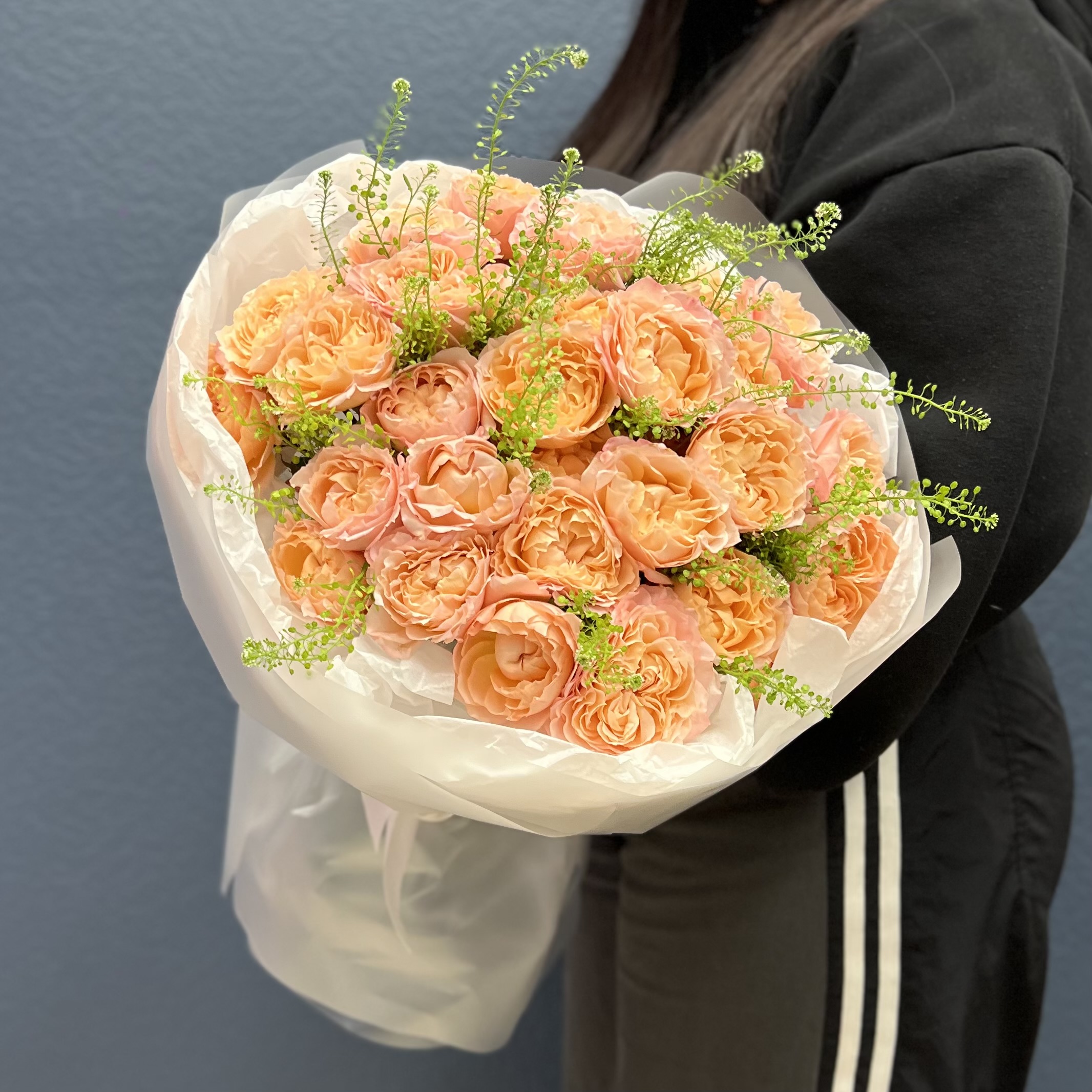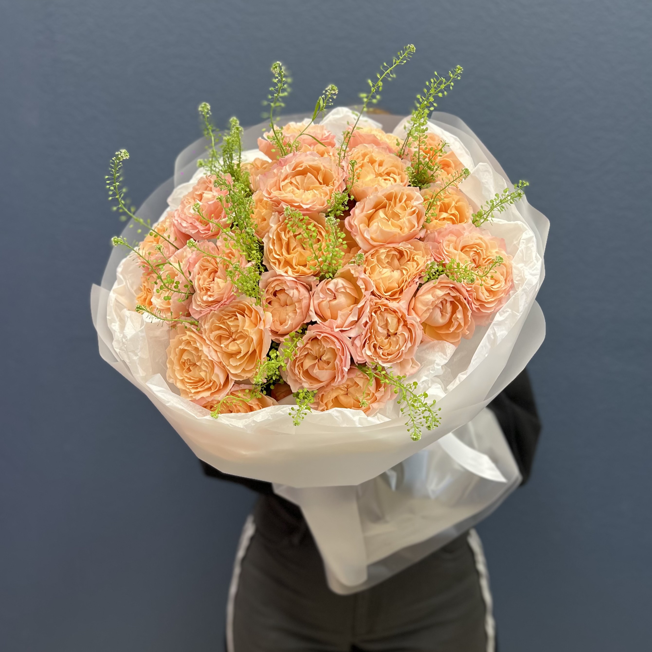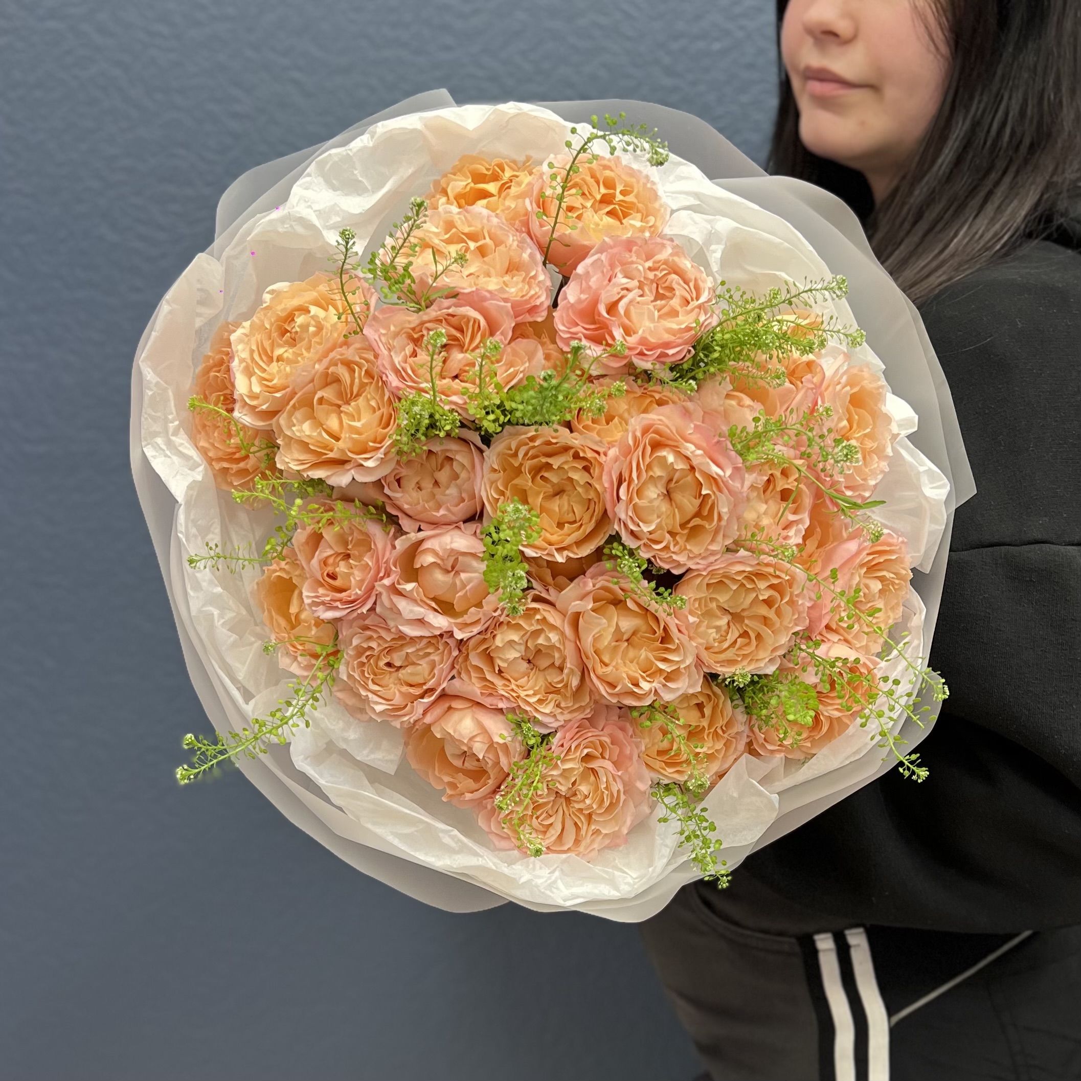 Моно-букет из Пионовидная роза Джульетта — воплощение нежности и утончённой роскоши. Объёмные бутоны персикового оттенка выглядят по-настоящему дорого и изысканно.