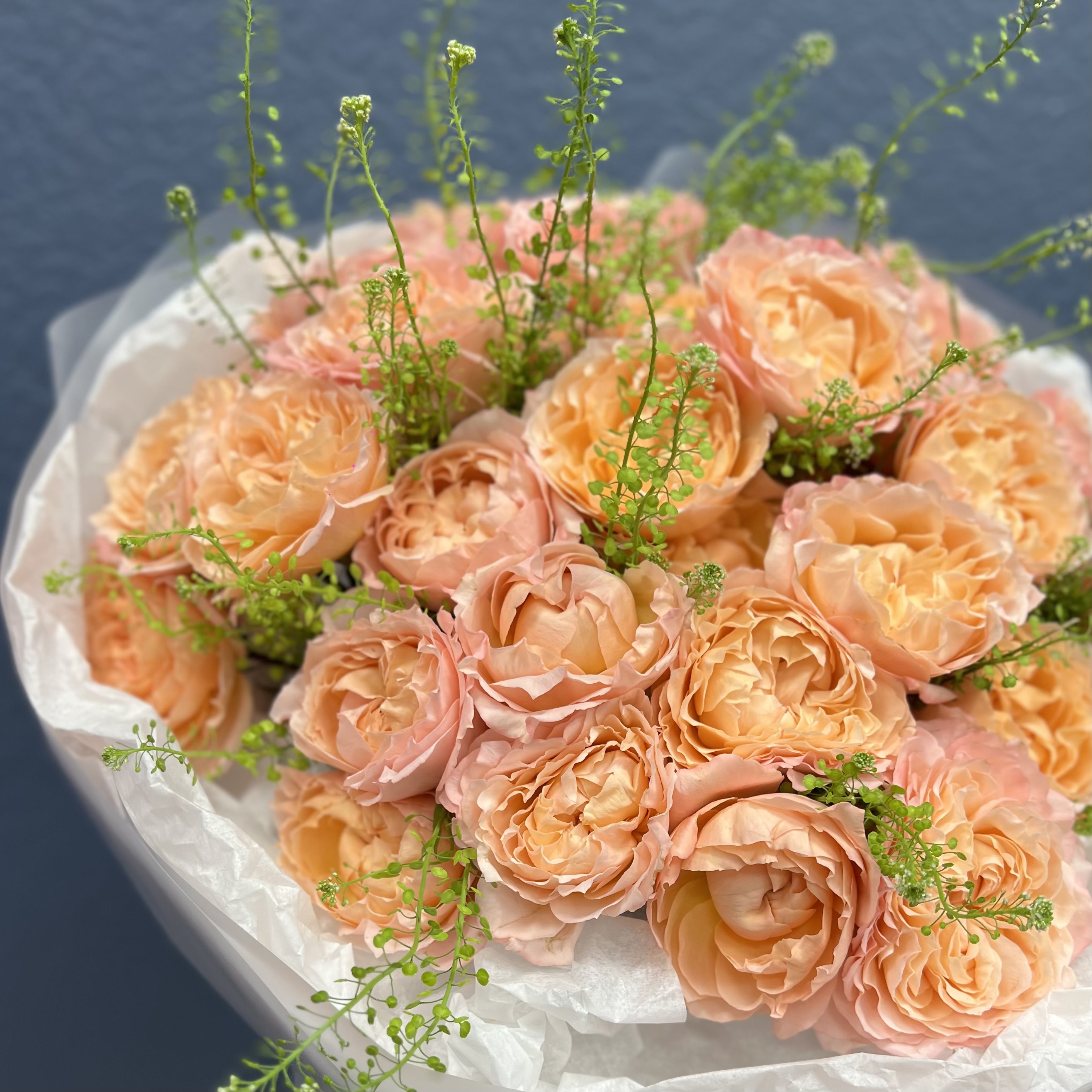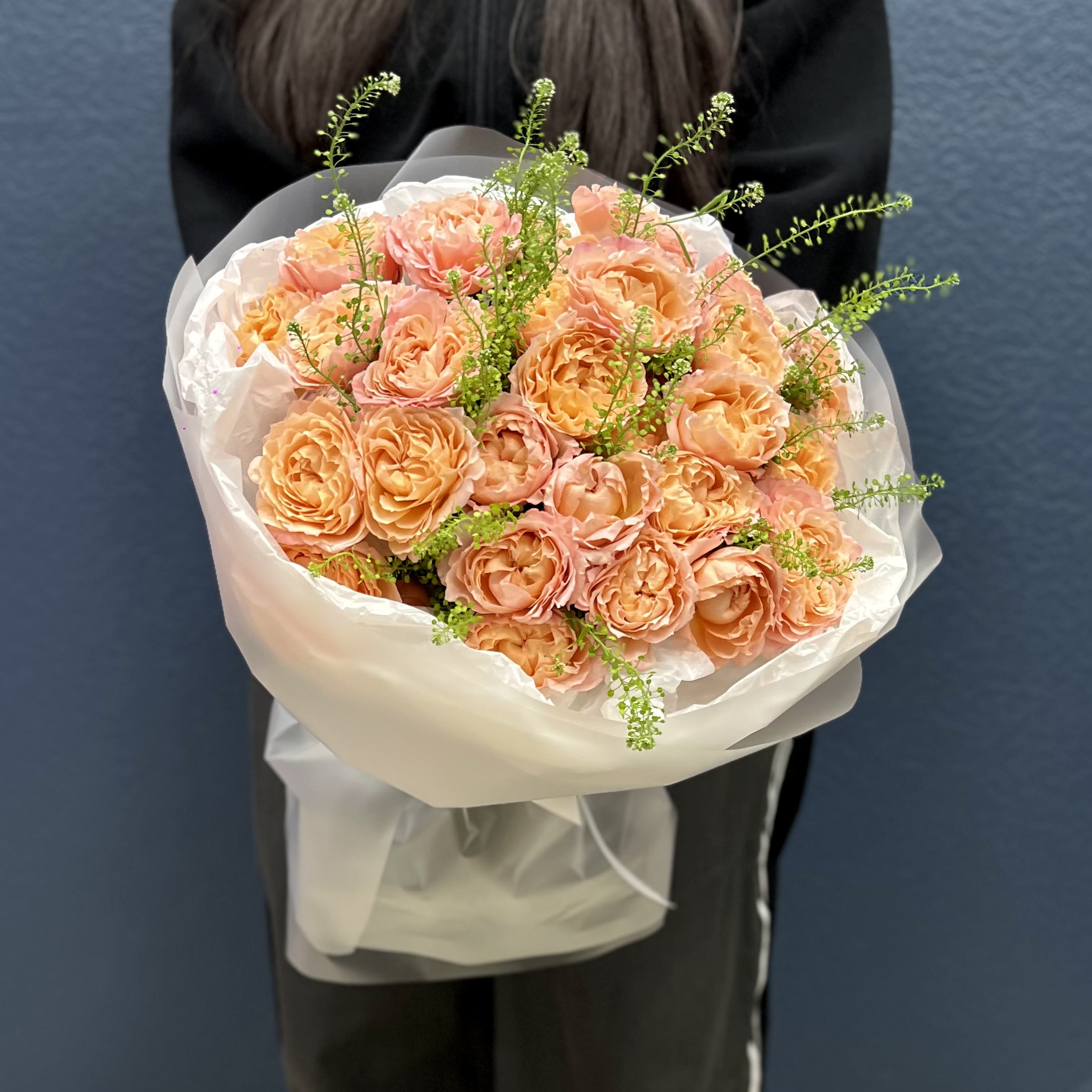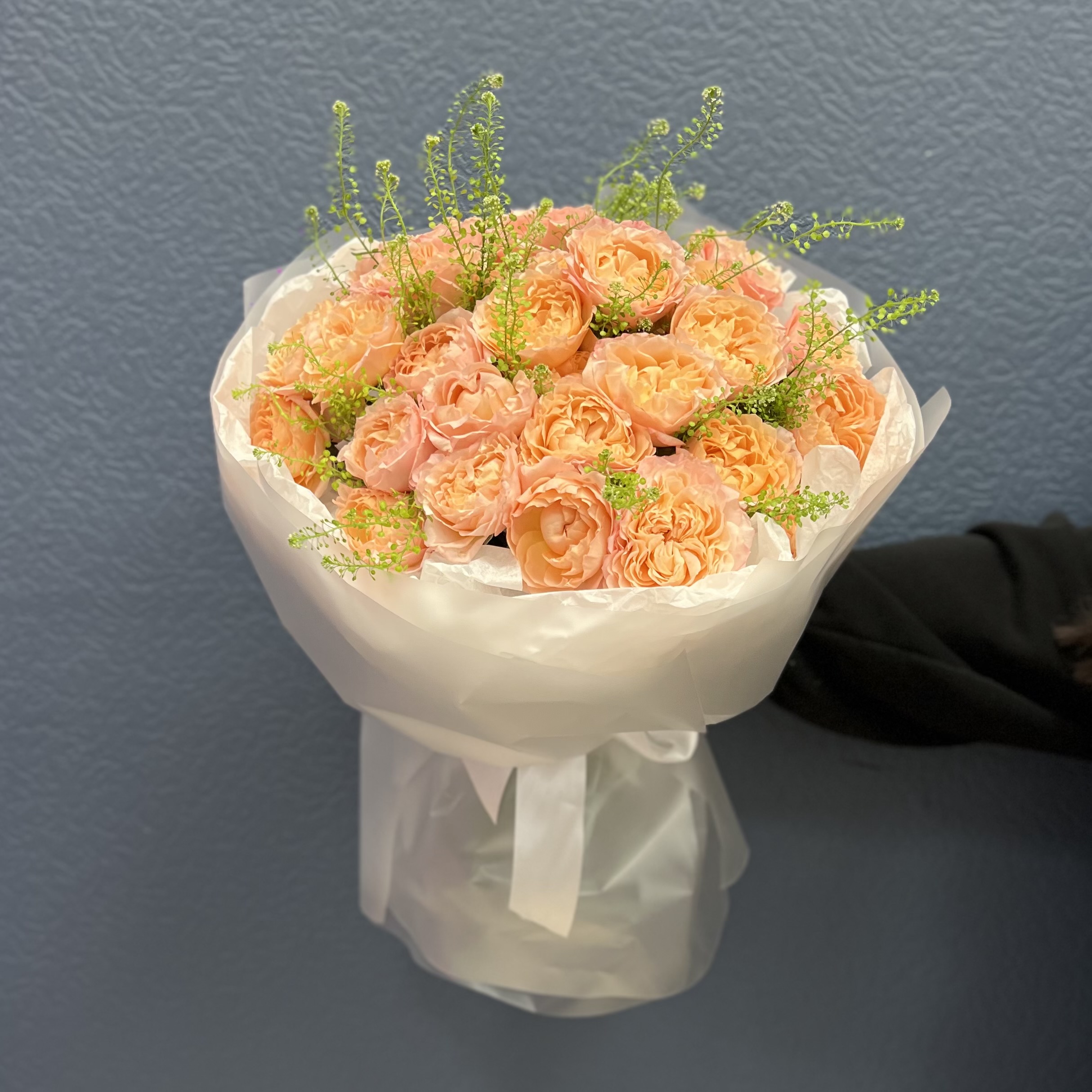 Моно-букет из Пионовидная роза Джульетта — воплощение нежности и утончённой роскоши. Объёмные бутоны персикового оттенка выглядят по-настоящему дорого и изысканно.