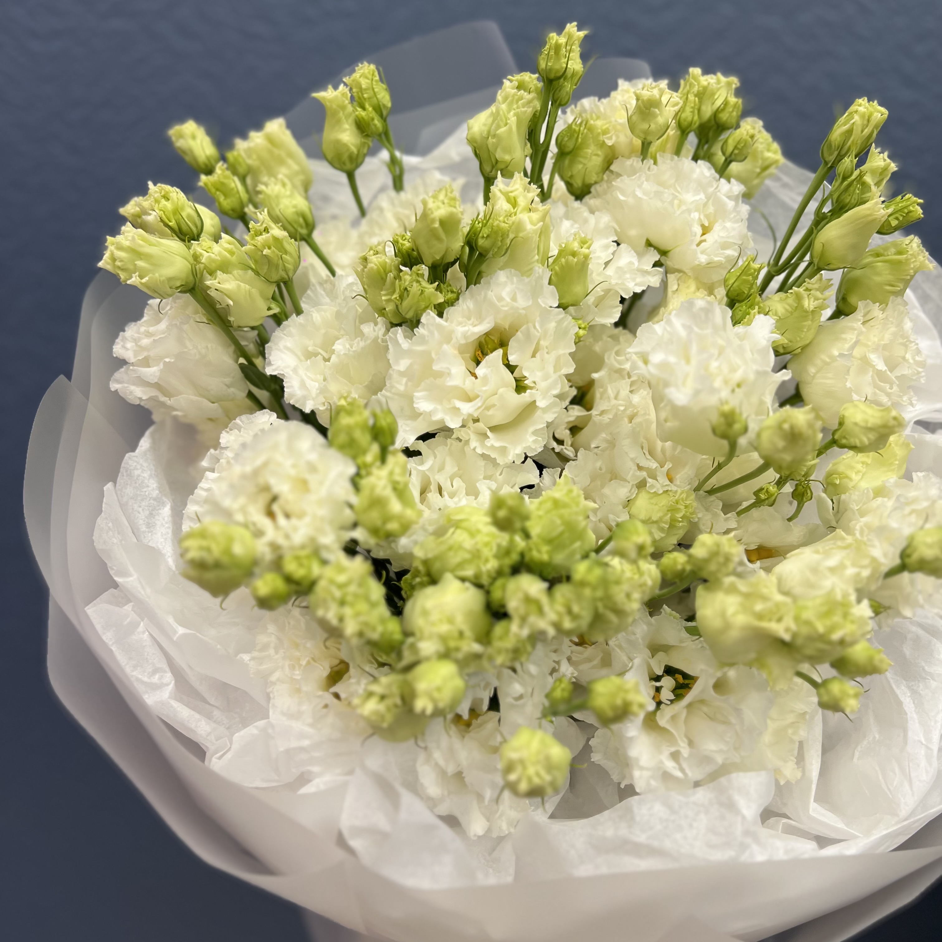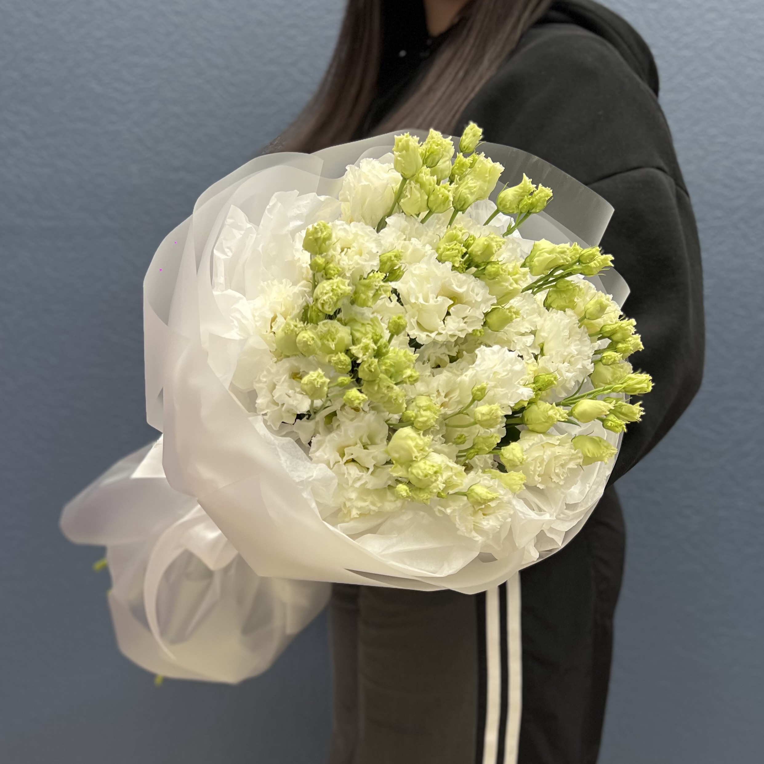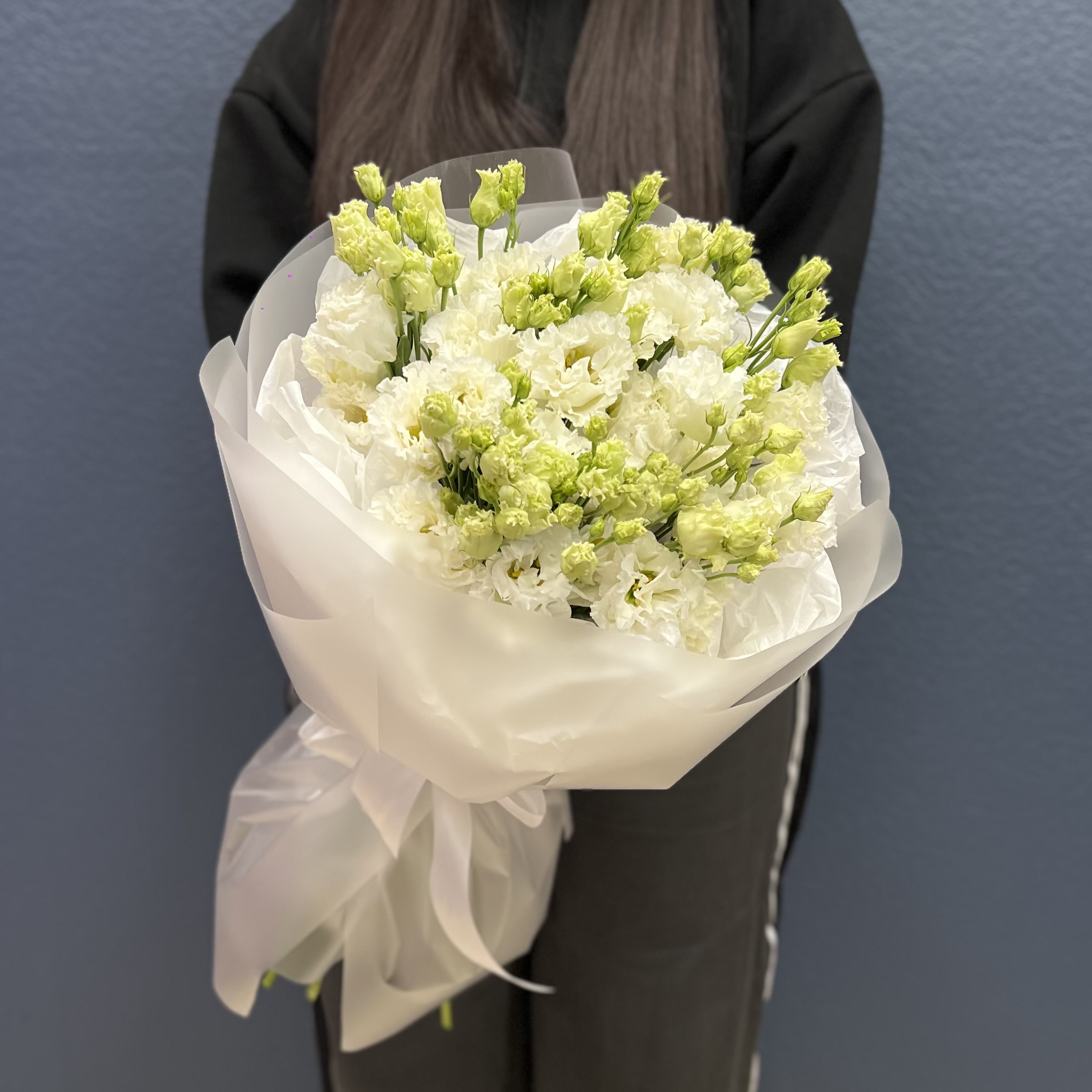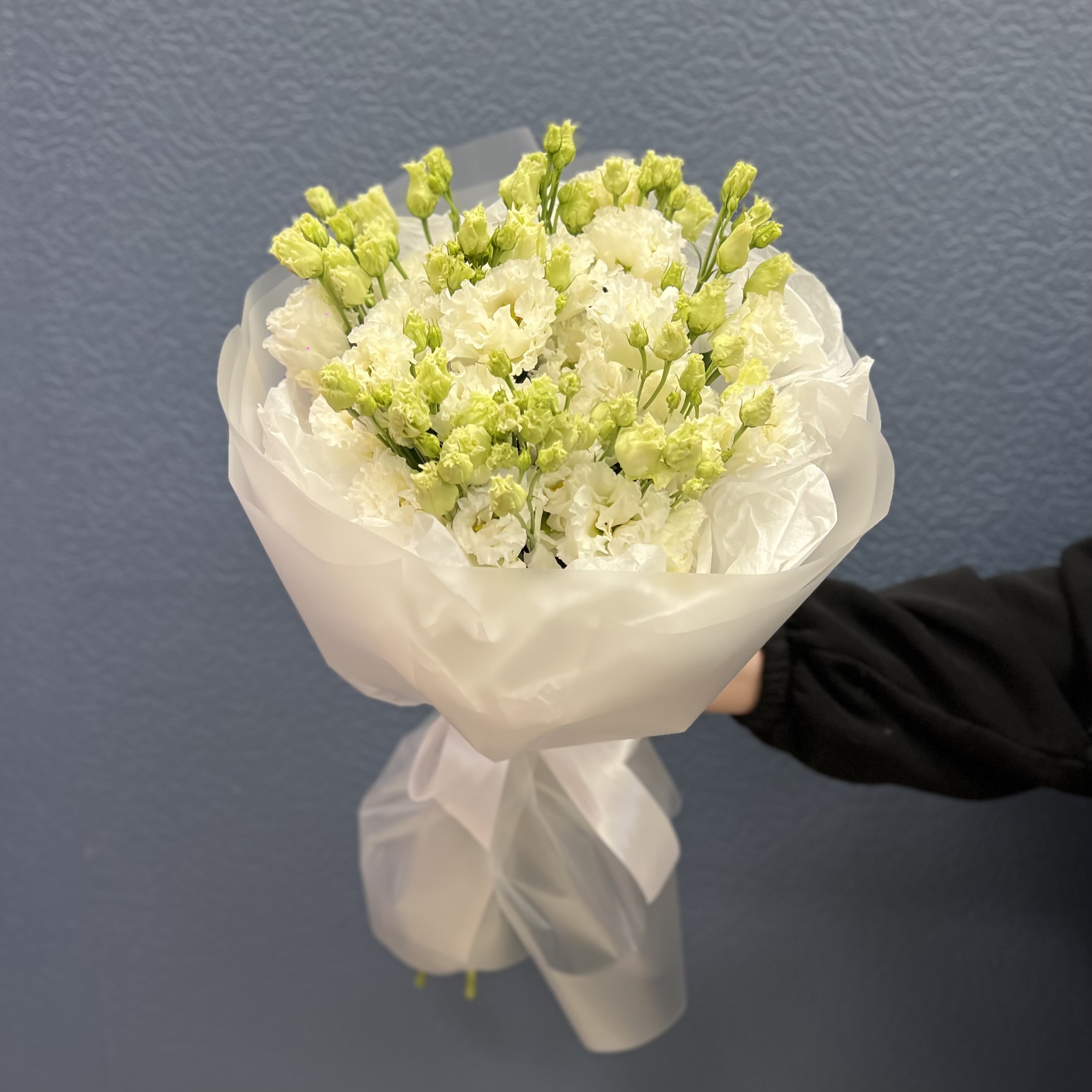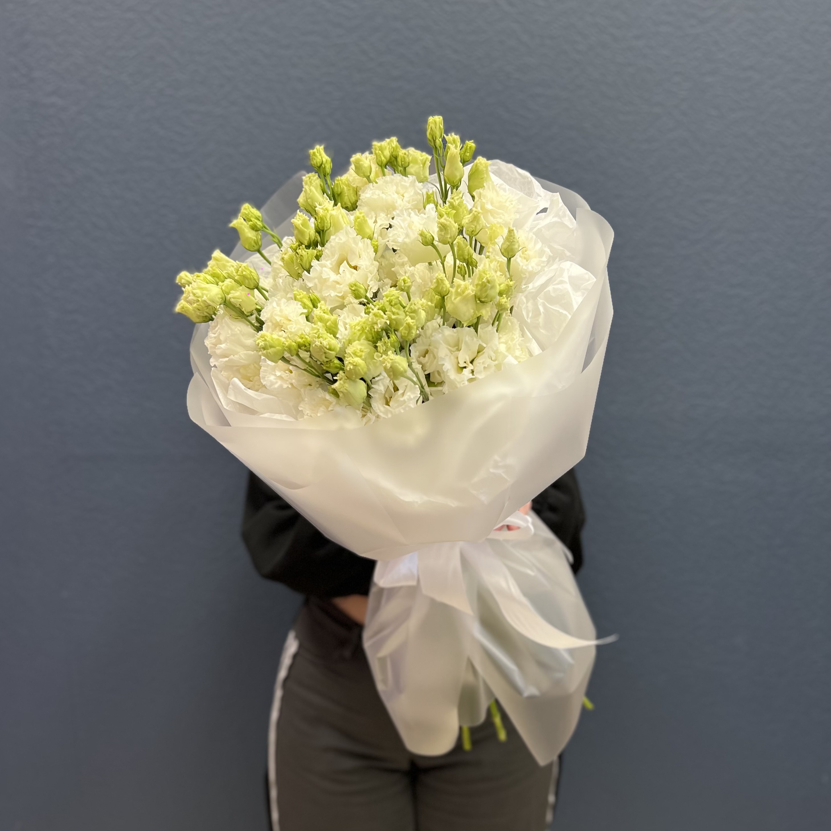 Моно-букет из Эустома — нежность в каждом лепестке. Белые махровые бутоны выглядят утончённо и воздушно, создавая ощущение лёгкости и элегантности.