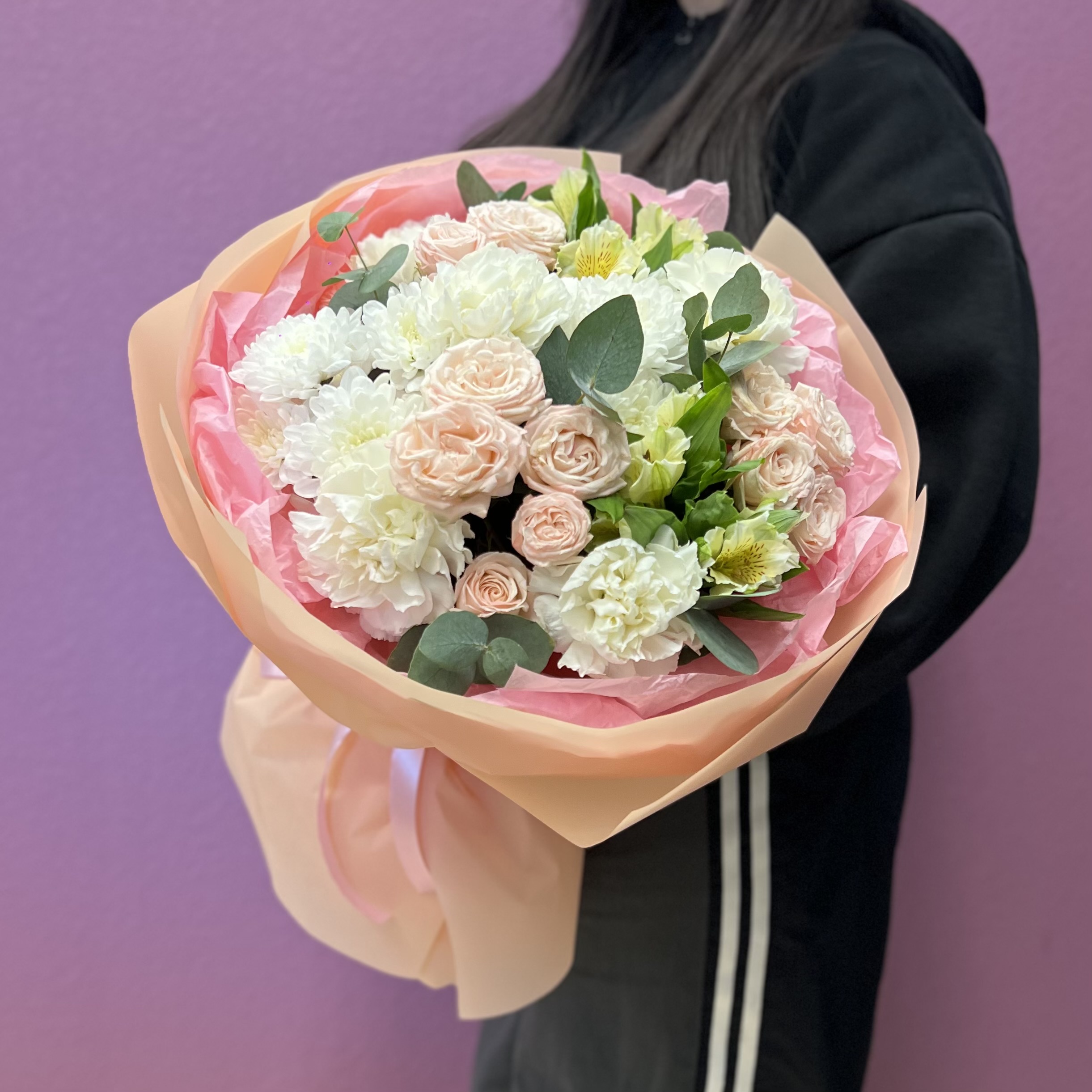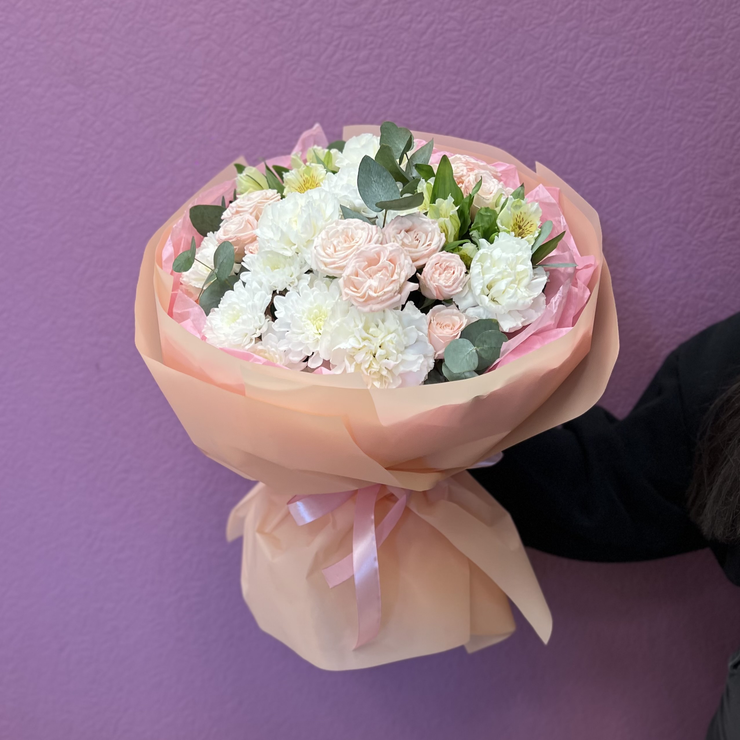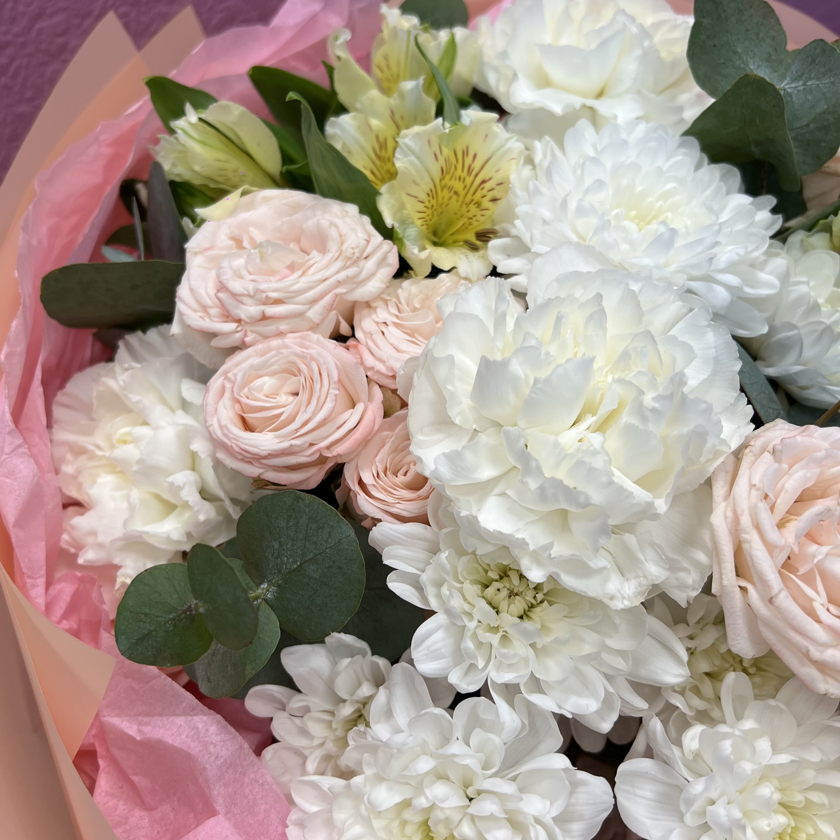 Нежный букет из нежно-розовой кустовой розы, белого диантуса, альстромерии и белой хризантемы — стильная и универсальная композиция для любого повода. Пастельные оттенки и гармоничное сочетание цветов создают ощущение свежести, лёгкости и искренности.