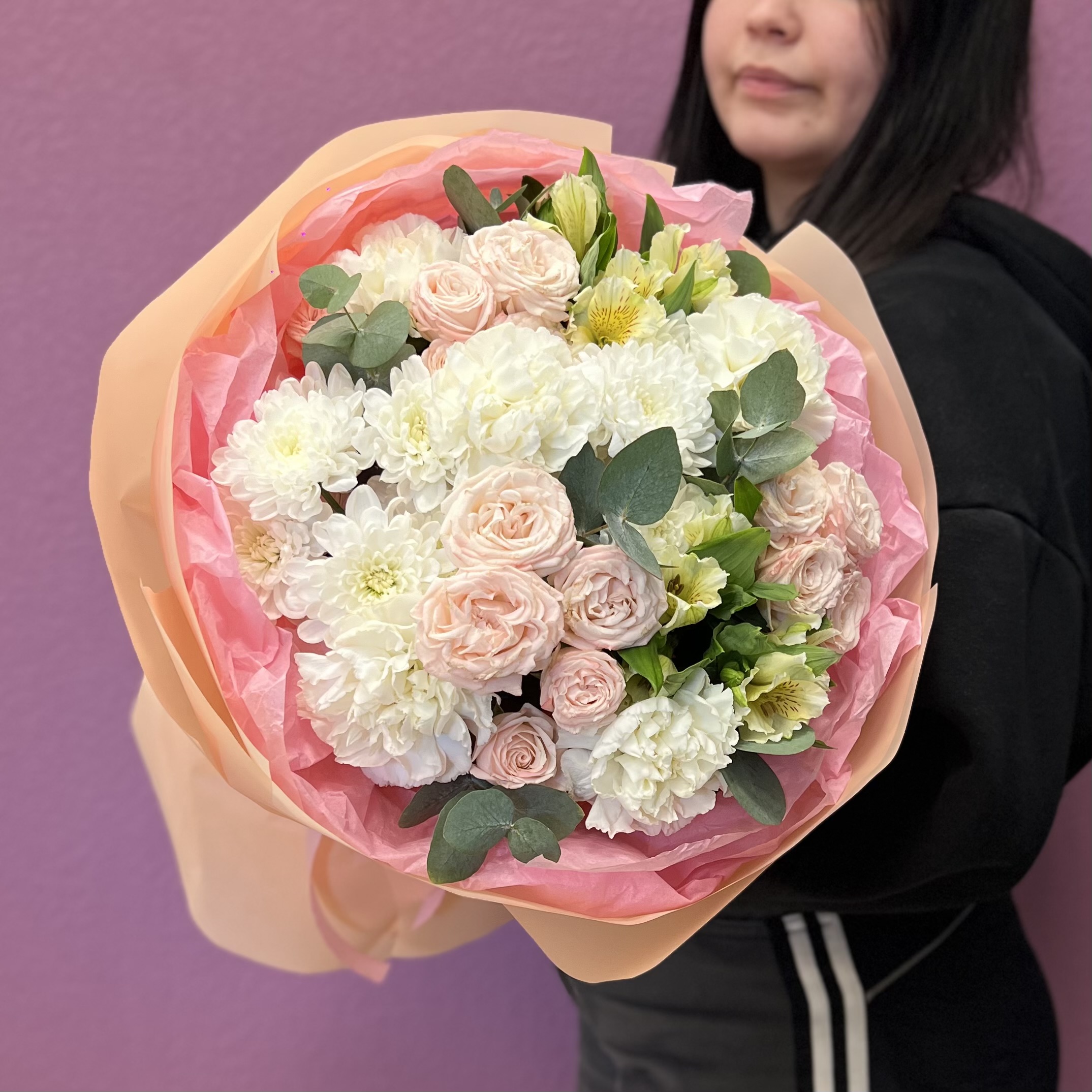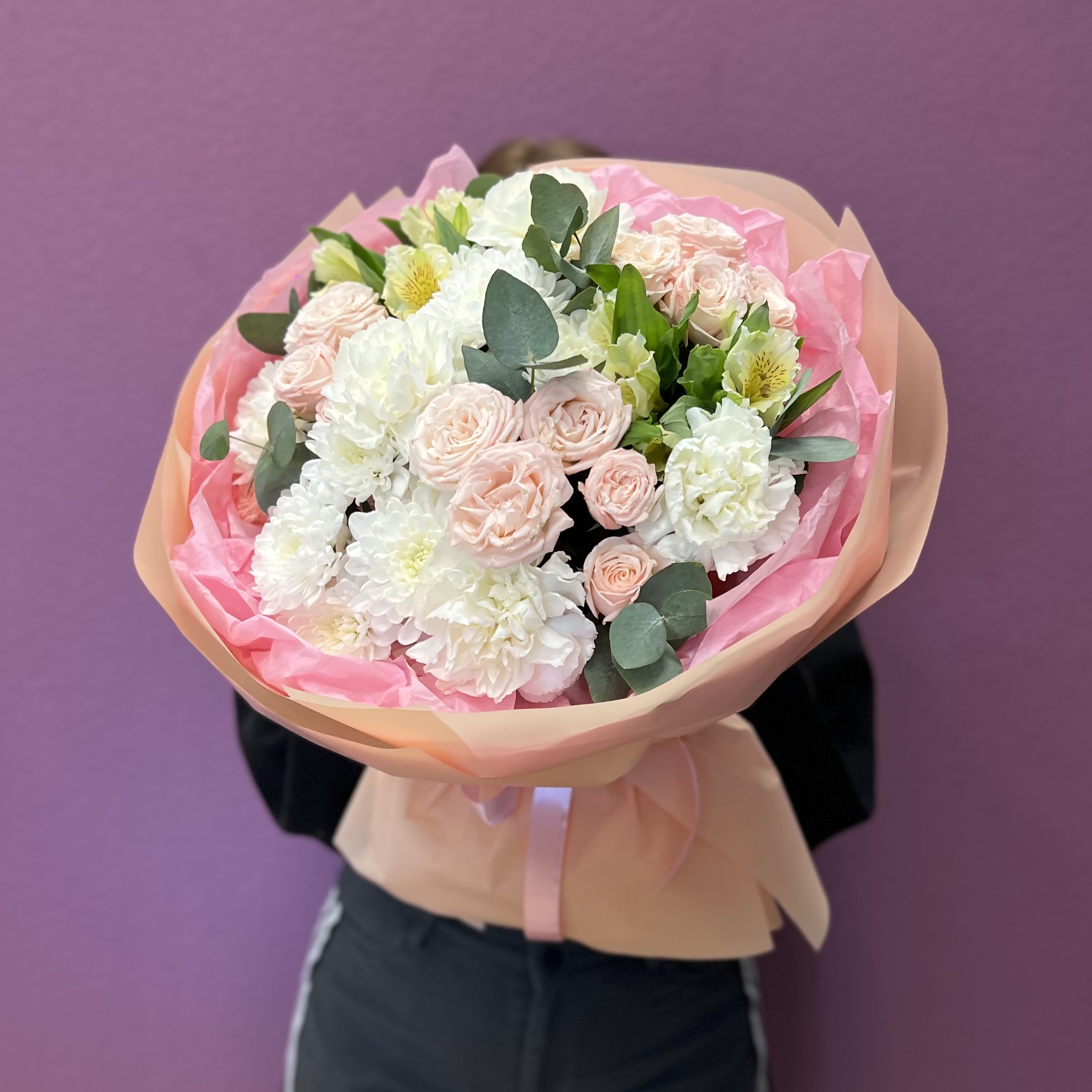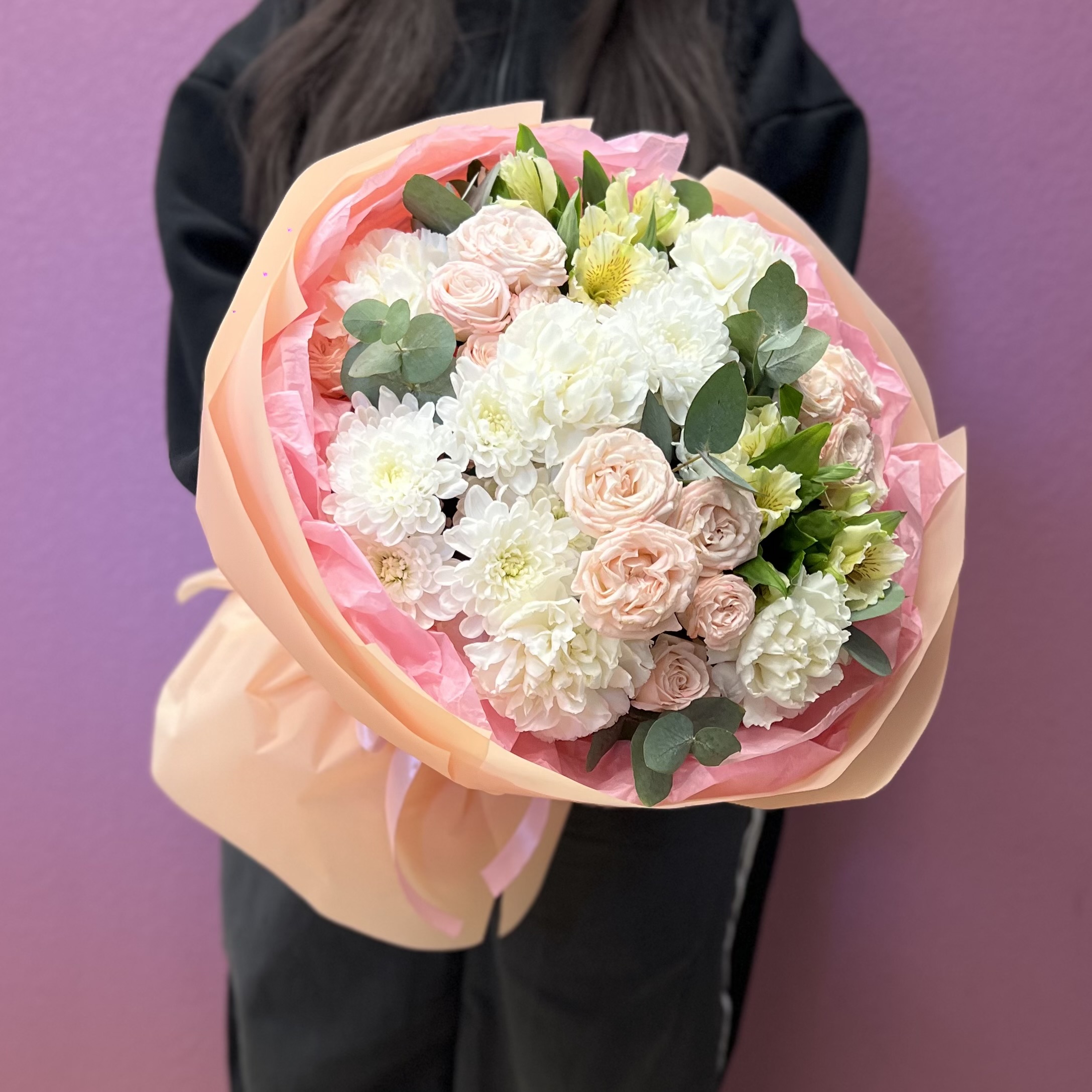 Нежный букет из нежно-розовой кустовой розы, белого диантуса, альстромерии и белой хризантемы — стильная и универсальная композиция для любого повода. Пастельные оттенки и гармоничное сочетание цветов создают ощущение свежести, лёгкости и искренности.