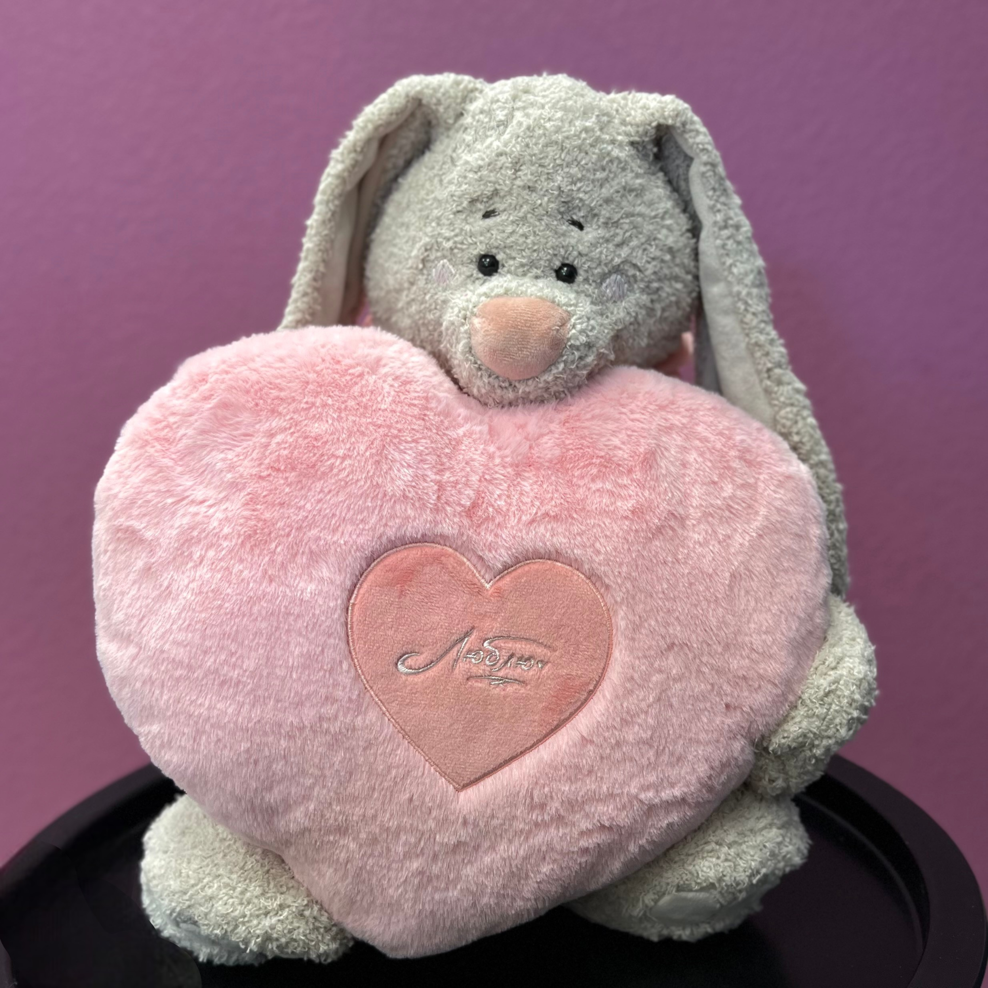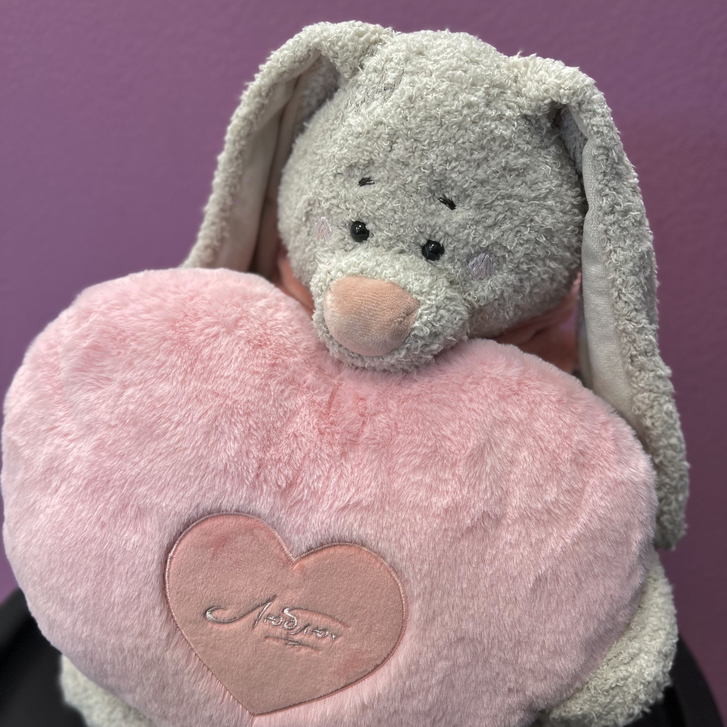 Заяц Вито в пудровой кофте, с сердцем подушкой, 37 см
